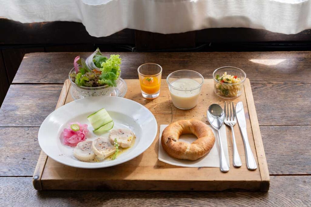 This cozy cafe is absolutely lovely! You can relax, soaking up the warmth of the old building’s wood. Enjoy the nostalgic atmosphere and try the Bagel Lunch! Made with carefully selected ingredients, everything tastes so good. For example, this amazing meal might feature chicken ballotine, vichyssoise, a generous salad, and more. Every bite is a delight that will make your heart sing! You’ll also love the fun of choosing from several different bagel flavors. The walnut and raisin bagel is such a comforting treat—it’ll bring a smile to your face!