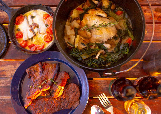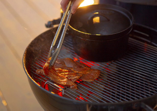 He leads me to the most stylish-looking tent I’ve ever seen. A large tarp has been set up in front of the tent, which seems to be for cooking and dining. I’m instantly excited when I see the large barbecue grill and the Dutch oven.