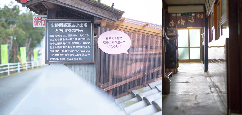 Just as I was starting to feel hungry, I arrive at Ishikawarou, a long-established restaurant that’s been around since the Edo period (1603-1865). The building juts out over the river like a kawadoko (river terrace), and a wonderfully simple, handmade sign out front catches my eye: “It’s thought that Kogoro Katsura once hid nearby.” It seems like we’ve stepped out of the ordinary.