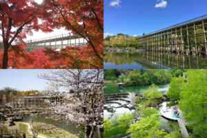 The Keihanna Commemorative Park, officially called the Kyoto Prefectural Kansai Culture and Science City Commemorative Park, is 24.1 hectares in size. It was built to commemorate the establishment of the Keihanna Science City (officially known as the Kansai Science City), and opened to the public in 1995. It has a free area and a paid area. The free area includes Hiroba (Open Space), which has a large, stepped lawn area resembling a tanada (rice terrace), where people can relax and children can run and play freely. There is also a free playground for kids. In the Taniai (Valley) area, you can view a typical Japanese landscape with a small stream, a bamboo grove, and a plum garden. In the paid area, there is Suikei-en, a Japanese-style garden with paths that bring you to fascinating spots including a cascading pond, a magnificent Rock Cluster, beautiful places with seasonal flowers, and Floating Stage where you can feed Japanese carp. It’s enjoyable for children and adults alike. Kangetsukyo Bridge is eye-catching. It’s 123 meters long, 4 meters wide, and approximately 10 meters tall above the water. From the bridge, you can enjoy the panoramic view of the large garden. Particularly spectacular is the fall foliage of the Maple Valley. Among the moss, approximately 140 Japanese maple trees line a small, delicate stream. Suikei-en is a wonderful place where you can view both satoyama (cultivated countryside) landscapes, and the large and beautiful bridge. Also, at Mebuki-no-Mori (Budding Tree Forest), you can enjoy strolling through abundant nature, which offers different scenery depending on the season. Additionally, you can enjoy a range of events, from firefly-viewing and star-gazing to traditional Japanese events.
