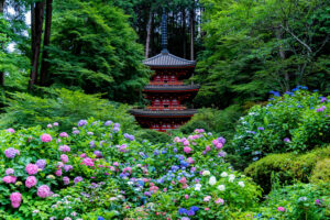 The Mimurotoji temple is located in Uji City in the Kyoto Tea Country region, southern Kyoto Prefecture. This temple has a long history, and its Treasure House enshrines Buddhist statues including Important Cultural Properties. It is also known for its magnificent gardens. Referred to as Hana no Tera (the flower temple), it is among the most renowned flower spots in the Kansai region. Strolling the garden paths during the blooming seasons allows visitors to be surrounded by a profusion of flowers. Around late February to March, weeping plums bloom on an elevated area, offering a lovely view together with the landscape of the city. Around April, 10,000 azaleas, including red ones, come into bloom. Additionally, around late April to early May, the other azalea garden showcases approximately 20,000 flowers in white and pink hues. Around June, about 20,000 hydrangea plants of various colors, such as blue, purple, pink, and white, can be enjoyed. Around late June to early August, lotus flowers (which bloom in the morning) can be seen in front of the main hall. Their gradation of colors, primarily white and pink, is very beautiful. The temple offers various other flowers and autumn foliage. Also, there is a pond and a dry rock garden where you can feel the beauty of Japan. Depending on the season, there may be a teahouse in the precincts. It would be nice to take a break there while enjoying the beautiful flowers.