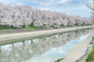 Maekawa Dike in Higashi-Imoarai is a beloved destination for hanami (cherry-blossom viewing), drawing crowds of all ages each spring. As one of the “200 Selected Nature Sites of Kyoto,” the beautiful promenades offer a quintessential Japanese spring scene. Mainly somei-yoshino (the most popular variety of sakura) trees line both banks of the river. When the petals fall, they float on the water, creating a picturesque sight. The reflection of the blossoms in the river adds to the enchanting ambiance. In the evening, the trees are illuminated, which creates a magical spectacle.