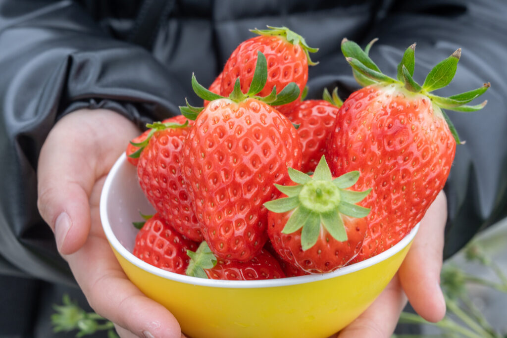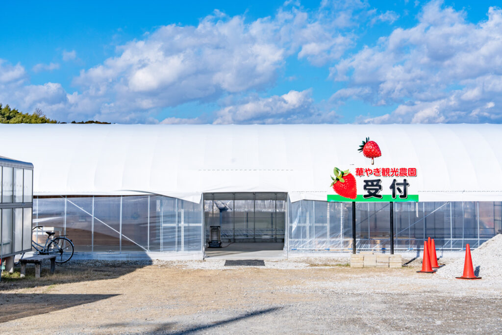 From winter to around spring, you can pick and enjoy the flavor of your own strawberries, freshly picked, sweet and juicy. (The exact timing varies from year to year.) You can eat as many strawberries as you like for 40 minutes. The main variety is the popular Akihime, with occasional Benihoppe. The bright red strawberries grow in abundance, which is a feast for the eye, too. They use raised beds, and there is no need to bend over low, and the aisles are wide. It’s a comfortable place offering an exciting experience for anyone, including people with strollers and wheelchairs. Furthermore, their greenhouses can accommodate large groups. Even groups of 200-300 people have enjoyed it. Groups can come by bus, too. In addition, the farm offers products using their strawberries, as well as freshly packed strawberries.