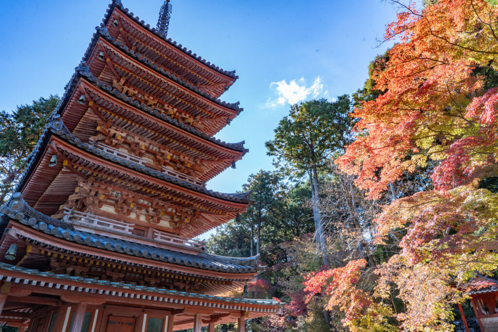 The five-storied pagoda is designated as a National Treasure. The vermilion pagoda, standing 17.7 meters tall, is a precious relic completed in 1214. The temple houses many other treasures. For example, there are many Important Cultural Properties, including the principal image of the Standing Eleven-Headed Kannon Bodhisattva, the Monjudo hall, a Mandala (a sacred geometric design) of the Lotus Sutra painted in color on silk, and documents about the temple.