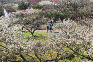 This ume (Japanese plum) grove, sprawling across the gentle hill along the Aodani River, has been a renowned plum blossom viewing spot since olden times. It’s even seen in poetry written by Emperor Godaigo’s son in the 14th century, which tells us that the grove has a very long history.